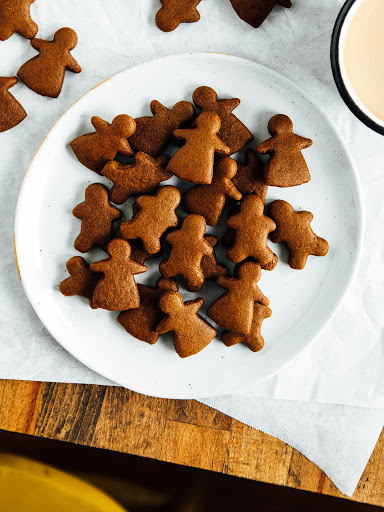 Preheat oven to 350˚F. Line a large baking sheet with a silicone mat or parchment paper; set aside. Line a flat surface with parchment paper and sprinkle with cacao powder (flour may leave white streaks on the cookies) (you can also use powdered sugar). Roll out the dough into a large slab that’s 1/8-1/4″ thick and cut with mini cutters. Transfer dough pieces to the prepared baking sheet and continue rolling out dough until your sheet is filled with gingerbread folk. Transfer to the freezer and freeze for 20-30 minutes then bake at 350˚F for 7-8 minutes. Allow to cool on baking sheet for 10 minutes then transfer to a wire rack to cool completely. Cookies will keep in an air tight container for up to three days.