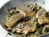 Pour the cream sauce over the mushrooms in the skillet, then add the fish, skin-side up. Simmer until the fish is just firm and translucent, 5 to 7 minutes. Garnish with parsley, if desired.