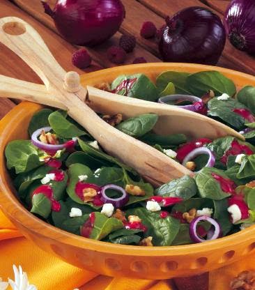 3. In a large salad bowl, combine the spinach, onion, cheese and walnuts. Drizzle with desired amount of dressing; toss to coat. Refrigerate any remaining dressing.