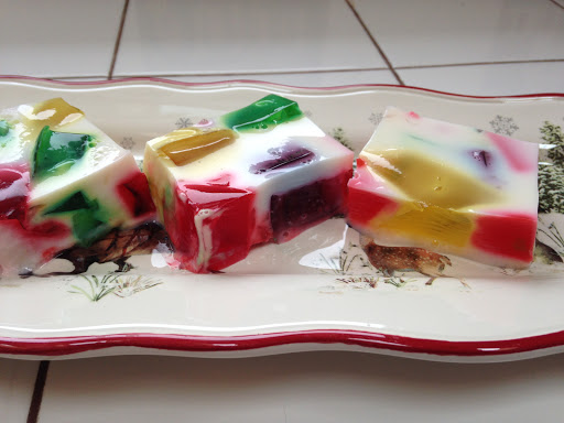 Once the Jell-O is solid, cut the flavors of Jell-O into small blocks and place the individual blocks in the bottom of a 9" x 13" glass pan, making sure to mix up the colors as the blocks are placed in the pan.