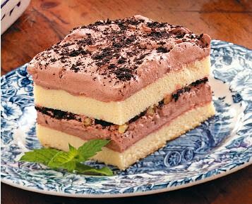 2. Spoon half over cake; sprinkle with walnuts and 1/2 cup