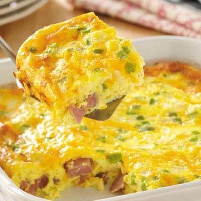 In a large bowl, whisk eggs and cream. Stir in the cheese, ham, green pepper and onion. Pour into a greased 9-in. square baking dish.