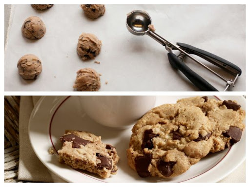 Edouard says to scoop the dough into mounds the size of golf balls. A medium cookie scoop with a capacity of 1 1/2 tablespoons is just right here, but you can also spoon the dough out using a rounded tablespoon of dough for each cookie. Place the dough on the lined sheets, about 2 inches apart.