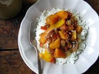 2. Meanwhile, slice pork or tofu into bite-size pieces or strips. Slice squash and pepper into chunks. Stir into softened tomatoes. Cover and reduce heat. Simmer, stirring occasionally, until squash is tender, 15 to 20 min. Great with basmati rice.