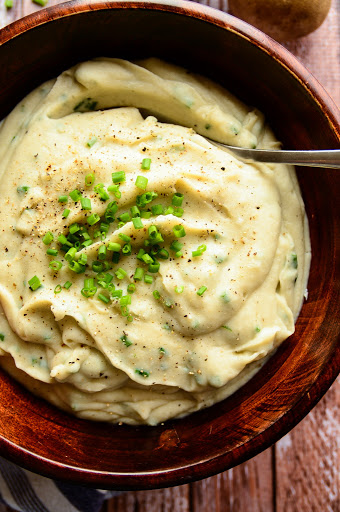 Add the cashew cream and the eggplant flesh to the pot with the potatoes and cauliflower. If you want a super smooth mash, use an immersion blender to puree the mash (this is what I do). If you want a thicker mash, beat the mashed potatoes with a hand mixer until smooth. Add in the sea salt, black pepper, and white wine vinegar (if desired) and continue to blend or mash.