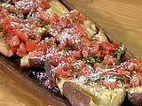 Remove baguette from oven and top with the tomato mixture. Garnish with basil and Parmigiano-Reggiano.