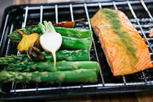 4) Set the timer to 8 minutes. Roast until the salmon is cooked through but still moist in the center.