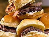 Cook burgers on the flat top for 3 to 4 minutes on each side. Serve on split rolls with grilled onions and mustard sauce.