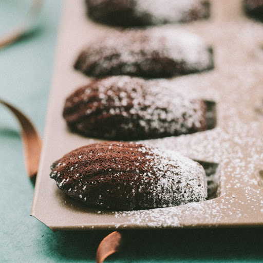 Sift flour and cocoa in a bowl. Combine baking powder and sugar. Add AF, oil, syrup and vanilla and mix until combine. Add gingerbread spice. Spoon into madeline molds.