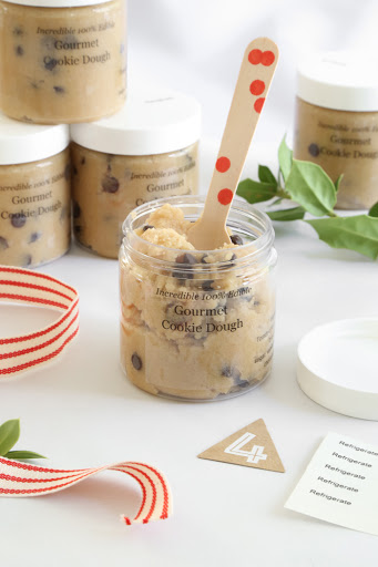When chocolate chips are evenly dispersed, add whole milk 1 tablespoon at a time with the machine on low speed. Scoop the cookie dough into six 4-ounce jars and twist the lids on tightly (nibble on the rest while you work). Print labels if using (see blog post) or tie on a hand-written tag. Include wooden spoons with the gifts for maximum cute factor!