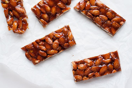 Now work quickly. I find the easiest way to flatten the top and reach the desired height (it should be the thickness of about 1/2 inch) is to place another oiled sheet of parchment face down on the top of the almond mixture and use a rolling pin to roll it to the right height. When doing this with smaller nuts, it's easy enough just to use the pressure in your hands (dampened with water) or a lemon half to push it out to the right size and height. If using the parchment and rolling pin, once you have reached the desired height, you can now rub the lemon half over the surface to add shine and a touch of flavor and to even out the brittle along the way. Let cool slightly. While the brittle is still warm, cut into pieces to serve (I find a large, heavy kitchen knife to be the best for this task). I like large bars for giving away as gifts, or small squares for serving with coffee at the end of a meal.