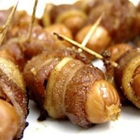 Cut bacon into thirds and wrap each strip around a little sausage. Place the wrapped sausages on wooden skewers, several to a skewer. Arrange the skewers on a baking sheet and sprinkle them liberally with brown sugar.