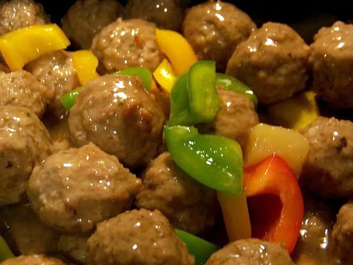 Drain pineapple and add enough water to make 1 cup. Blend corn starch and stir in all but pepper and pimento - Cook until clear and pour over meatballs. Simmer for 30 minutes then add green pepper and pimento and pineapple chunks. Simmer for another 15 minutes.