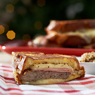 To prepare the sandwich, start by preheating the oven to 350°F. Spread mustard on each slice of the challah. With the mustard side up, put 2 slices of Swiss cheese on 4 of the challah slices. Put the sausage patties on top of the Swiss cheese, followed by 2 slices of ham. Top with remaining cheese. Place the 4 other bread slices, mustard side down, on top of the cheese layer.