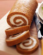 * Line a 15-in. x 10-in. x 1-in. baking pan with waxed paper. Coat the paper with cooking spray; set aside. In a large bowl, beat eggs for 3 minutes. Gradually add sugar; beat for 2 minutes or until mixture becomes thick and lemon-colored. Beat in pumpkin and extract. Combine the flour, cinnamon, baking powder, ginger and salt; fold into pumpkin mixture. Spread batter evenly into prepared pan.