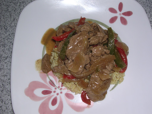 Mix brown gravy mix, water, soy sauce and ground red pepper until will blended. Heat oil in a large skillet on medium high-heat. Add steak and cook 2 minutes or until no longer pink. Stir in gravy mixture, onion and bell pepper. Bring to a boil. Reduce heat and simmer on low 6 to 8 minutes until sauce has thickened, stir occasionally. Serve over rice.
