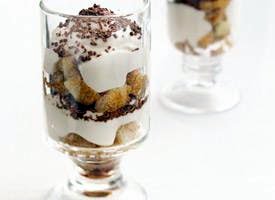 2. In 8 small parfait glasses or clear drinking glasses, layer half of the ladyfingers, half of the espresso mixture and half of the cheese mixture. Sprinkle each with about 3/4 teaspoon grated chocolate. Repeat layers.