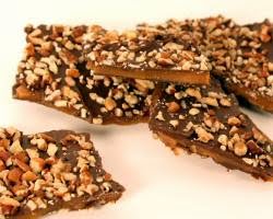 Place a large heavy pan on stove on high temp. Heat pan till it is very hot. Pour sugar and water in pan and stir for about 5 seconds. Add cold butter and salt, melt butter by stirring vigorously. Keep stirring until mixture is frothy and light brown. Remove from heat. Pour onto a greased cookie sheet. Spread to about 1/8th inch thick. Place chocolate onto mixture and allow to melt then spread. Sprinkled with chopped nuts