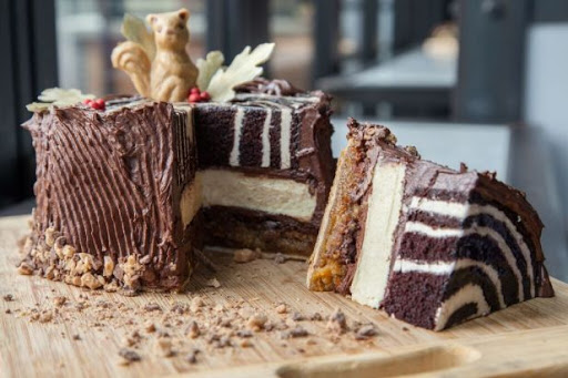 On an 8 inch cake board or serving plate place a small dollop of frosting to secure the pie. Place the trimmed, chilled pie on top of the frosting dollop. Spread a thin layer of frosting on top of the pie. Place the cheesecake on top and coat with another thin layer of frosting. Place the roll on top with the cut side facing up, you may have to fill in the bottom side of the roll with extra frosting so there are not air gaps.
