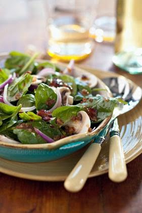 For the salad, in a large bowl, toss together the spinach, mushrooms, and onion. Pour the dressing over the salad and toss to combine. Serve warm.