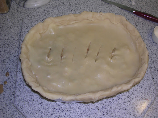Roll the dough 1 inch larger than the dish. Put the crust over the casserole dish and flute the edges. Cut 2 to 3 slits in the top of the crust for the steam to escape. Bake on the middle rack of the oven for 15-25 minutes until the crust is golden. Serve hot
