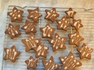 3. When ready to bake, place a rack in the center of the oven and preheat the oven to 375 degrees F. Lightly flour a work surface and remove the dough from the refrigerator. Scrape about half of the dough onto the work surface. Lightly flour a rolling pin, and firmly tap the dough with the rolling pin until it is about 1-inch thick. Roll out the dough to about 1/4-inch thickness, lightly rolling from the center out to the edges and flipping the dough over every so often so that it does not stick to the work surface. Dust the dough and surface with flour as needed. Cut the dough with star cutters (or the cookie cutter of your choice), pressing firmly down on one stroke. With the help of a metal spatula, transfer the cut-outs to ungreased cookie sheets, placing the cookies about an inch apart. Place the pans in the oven. Keep the remaining dough chilled, press the scraps into a loose ball, and roll the scraps and rest of the dough and cut into shapes.
