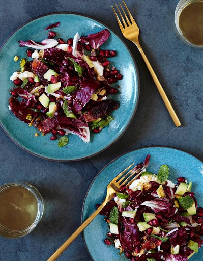 In a large bowl, combine orange supremes, mint, pistachios, pomegranate seeds, avocado and radicchio. Rewhisk vinaigrette and toss in just enough to coat leaves. Season with salt.