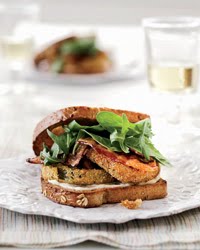 4.Lay 4 slices of toast on a work surface and lightly spread with mayonnaise. Top with the green tomatoes, bacon and arugula. Close the sandwiches, cut in half and serve.