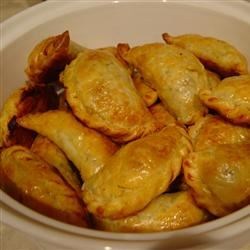 Line baking sheet with foil; sprinkle with flour. Place gyoza wrappers on work surface. Lightly brush edge. Place heaping 1 teaspoon filling in center of each gyoza wrapper. Fold wrapper in half and crimp edges with tines of fork to seal. Transfer empanadas to prepared baking sheet. (Can be prepared 6 hrs ahead and refrigerate.)
