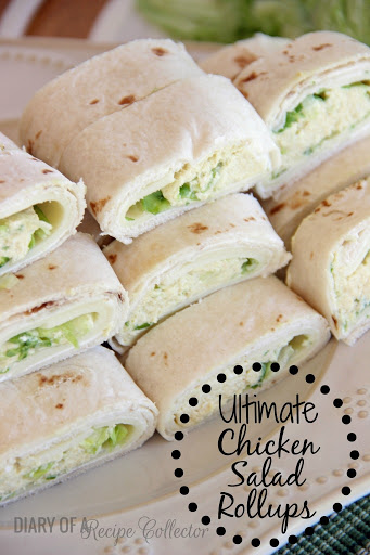 To assemble: Spread about 1 tbsp whipped cream cheese on tortillas. Add 3 slices of provolone to the edge of the tortilla (see picture). Top with shredded lettuce and finally 3 -4 tbsp of chicken salad. Starting at one end, roll up. Repeat with remaining ingredients.