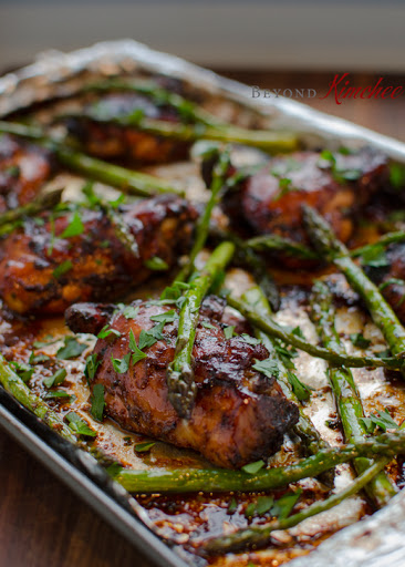 Take out the pan and coat the chicken and the asparagus with the remaining glaze on the pan. Serve hot!