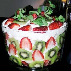 Make fan garnishes of whole strawberries by slicing from just below the stem. Garnish assembled trifle with fanned strawberries, reserved kiwi slices, and a sprig of mint. Refrigerate until serving.