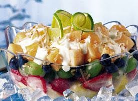 In 2 1/2-quart clear glass bowl, layer fruit in order listed. Pour yogurt mixture over fruit. Sprinkle with coconut. Serve immediately.