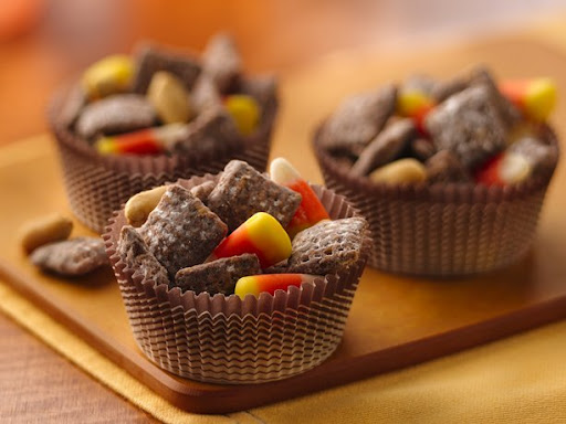 Add powdered sugar. Seal bag; shake until well coated. Add candy corn and peanuts; shake to mix. Spread on waxed paper to cool. Store in airtight container in refrigerator.