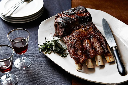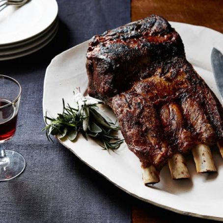 Preheat oven to 375 degrees. Brush off any herbs and garlic stuck to meat. Heat roasting pan on stove over medium-high heat. Add grapeseed oil and, once hot, brown rack on all sides, about 5 minutes per side.