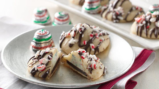 Shape dough into 36 (1-inch) balls. Press 1 HERSHEY’S peppermint bark bell into center of each dough ball, covering completely. Place 2 inches apart on ungreased cookie sheets.