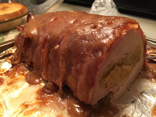 Pour Glazing over the Entire Pork Loin and bake for at least another 15 minutes or until internal temp of the Pork Loin is at 165 deg.
