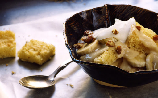 In 4 bowls or 10-oz glasses make 2 layers each of pudding, bananas, cake (use all of it), and chopped pecans, then top with a third layer of pudding, bananas, and chopped pecans.