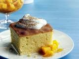 Before serving, make the topping: Peel, pit and dice the mangoes. Puree half the mangoes in a blender with 2 tablespoons sugar. Transfer to a bowl and fold in the remaining diced mango.In a separate bowl, beat the heavy cream and the remaining 1 tablespoon sugar with a mixer until soft peaks form. Slice the cake; top each piece with the whipped cream and sprinkle with cinnamon. Serve the mango topping on the side.