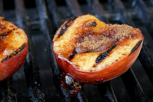 - 4 not-too-ripe peaches, washed, halved and pitted (too ripe and they fall apart on the grill)