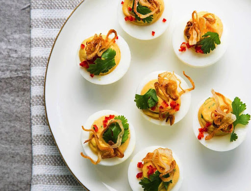4. While the shallots cool, use a spoon or pastry bag to carefully fill each egg white half with the egg yolk filling. Top each deviled egg with a couple of crispy shallots, a cilantro leaf, and a pinch of minced red jalapeño. Serve immediately.
