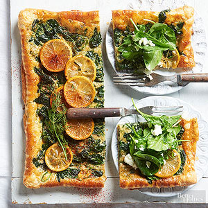Meanwhile, zest and juice the lemon. In a medium bowl whisk together 1 teaspoon lemon zest, eggs, creme fraiche, snipped dill, 1/2 teaspoon salt, 1/4 teaspoon pepper, and nutmeg. Stir in chopped spinach mixture and feta. Spread over the surface of the pastry. Bake about 30 minutes or until pastry is puffed and nicely browned on the bottom and filling is set. Slide onto a wire rack; cool.