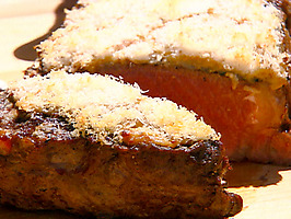 Remove steaks from grill and place on a large baking sheet. Cover top generously with garlic-mustard coating. Top with large piles of Parmesan, spreading out to edges carefully with fingers. Place steaks in oven for 8 or 9 minutes.
