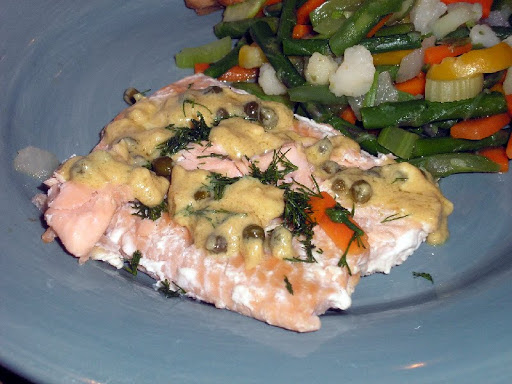 To serve, spoon sauce over salmon & sprinkle with dill.