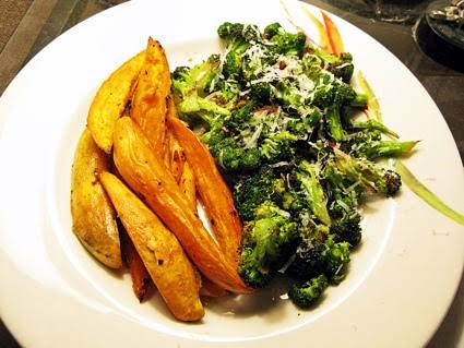 Take 4 to 5 pounds of broccoli , cut into florets (but relatively big ones.) Here's the key that she doesn't mention in the recipe: dry them THOROUGHLY. That is, if you wash them. I saw an episode of Julia Child cooking with Jacques Pepin once when Pepin revealed he doesn't wash a chicken before putting it in a hot oven: "The heat kills all the germs," he said in his French accent. "If bacteria could survive that oven, it deserves to kill me." By that logic, then, I didn't wash my broccoli; I wanted it to get crispy and brown. If you're nervous, though, just wash and dry it obsessively.