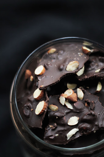 Finely chop the chocolate and melt it in a double boiler. I used a bowl placed on a pot of boiling water to do this. When the chocolate fully melted, add the instant coffee powder and stir well. Add about 1/4 cup of the nuts and mix it.