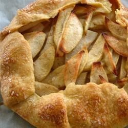 Meanwhile, dust a large sheet of parchment paper with flour and roll out the dough on the paper to an 11-inch round. Transfer the dough on the parchment paper to a heavy large baking sheet. Spoon the apple mixture over the dough, leaving a 2-inch border. Fold the dough border over the filling to form an 8-inch round, leaving the apples exposed in the center. Pleat loosely and pinch the dough to seal any cracks. Brush the crust with the egg wash and sprinkle with the remaining 1 tablespoon of sugar.