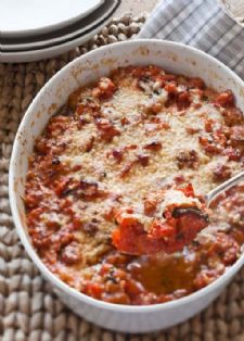 Pour the tomato mixture into a shallow (6 to 8 cup) baking dish. Sprinkle evenly with the Parmesan cheese and drizzle with 2 tablespoons of olive oil. Bake for 35 to 40 minutes until the top is browned and the tomatoes are bubbly. Serve hot or warm.