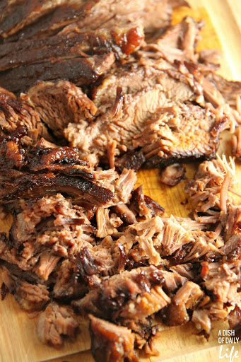 Bring the meat to room temperature (30 minutes) and then bake at 275 degrees for 5 hours. Remove foil and pour about 1 cup of barbecue sauce over the meat. Bake for an additional 60 minutes with the foil open.