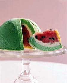 4.Place sorbet in chilled mixer bowl. Beat on low speed until sorbet has softened, about 1 minute. Fold in wafer pieces. Remove mold from freezer. Pack sorbet into center, making an even layer that comes to 1/3 inch below the top of the ice cream layer. Cover sorbet portion with sponge cake; trim cake if necessary. Return mold to freezer until completely hardened.